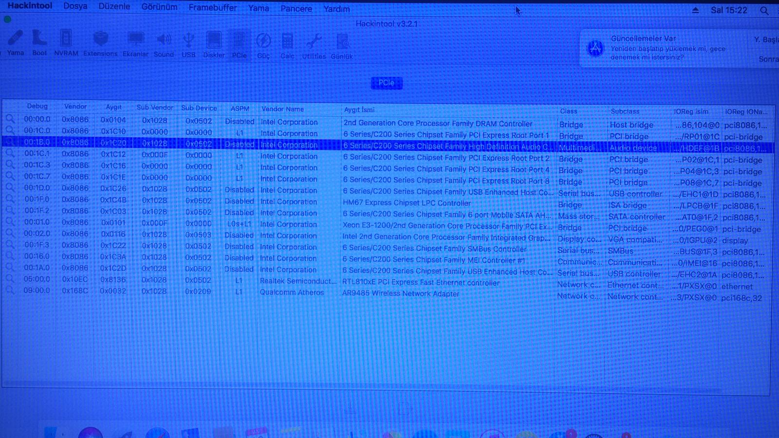 6 Series/C200 Series Chipset Family High Definition Audio Controller mevcut PCIe'den baktığımda bu arada Qualcomm Atheros wireless'ta mevcut burdan baktığımda ve Hackintool üzerinde ses olarak Sound sekmesi mevcut bir tek