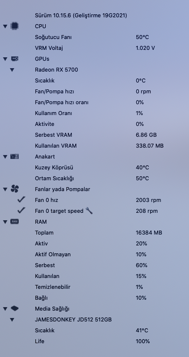Hocam hwmonitor diye bi uygulama indirdim onun içindeki kextler ile bi kaç bişeler yaptım virtualsmc yi sildim onun içerisindeki fakesmc yi kullandım ve bi kaçtane amdcpumonitor gibi kext vardı yukledım. Şuan cpu ve diğerlerini görüyor bir tek ekran kartını görmediVirtual smc sil yerine fakesmc kullanarak dene istersen ama saçma olabilir. Opencore config işlemeyi silmeyi unutma.